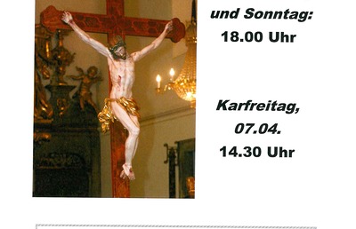 Kreuzwegandachten 2023 Wir feiern in der Fastenzeit jeden Freitag und Sonntag um 18.00 Uhr die Kreuzwegandacht. Am Karfreitag, 7. April Kreuzwegandacht um 14.30 Uhr. mehr: Kreuzwegandachten 2023