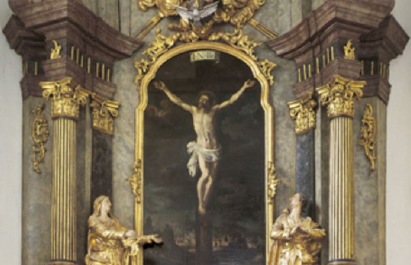 Der Kreuzaltar im Süden entstand 1771 im Zusammenhang mit der Neugestaltung der Kirche nach 1769. Er umschließt ein älteres Altarbild mit dem Gekreuzigten aus dem 17. Jahrhundert, das sich mit den beiden flankierenden, vergoldeten Figuren Mariens und Johannes des Evangelisten zu einer Kreuzigungsgruppe zusammenfügt. Auf diese bezogen ist die Skulptur Gottvaters im Zentrum des Altarauszugs. Zusammen mit der Taube des Heiligen Geistes schwebt er vor einer Wolkengloriole mit Strahlenkranz.