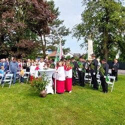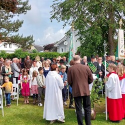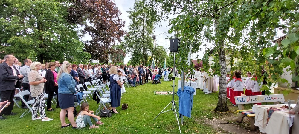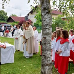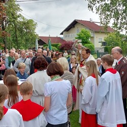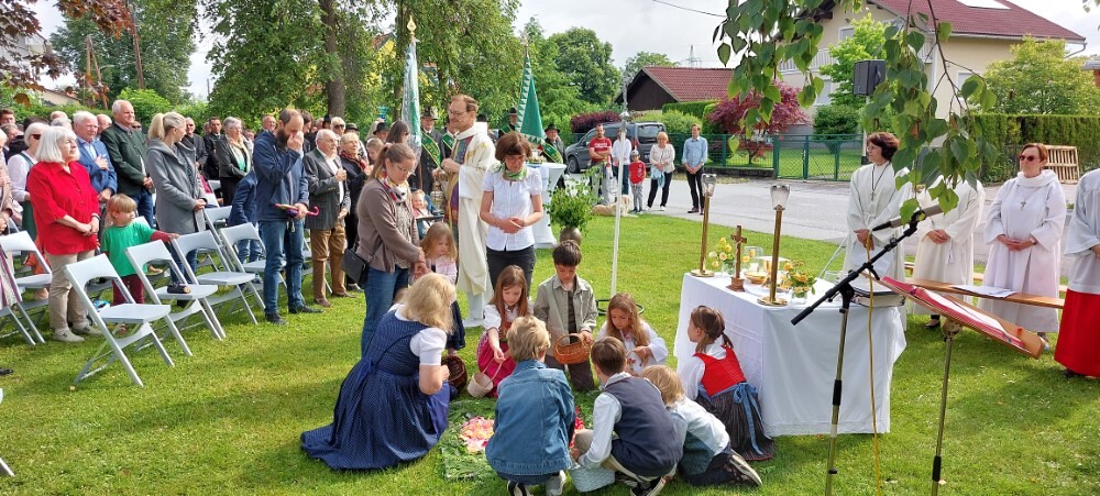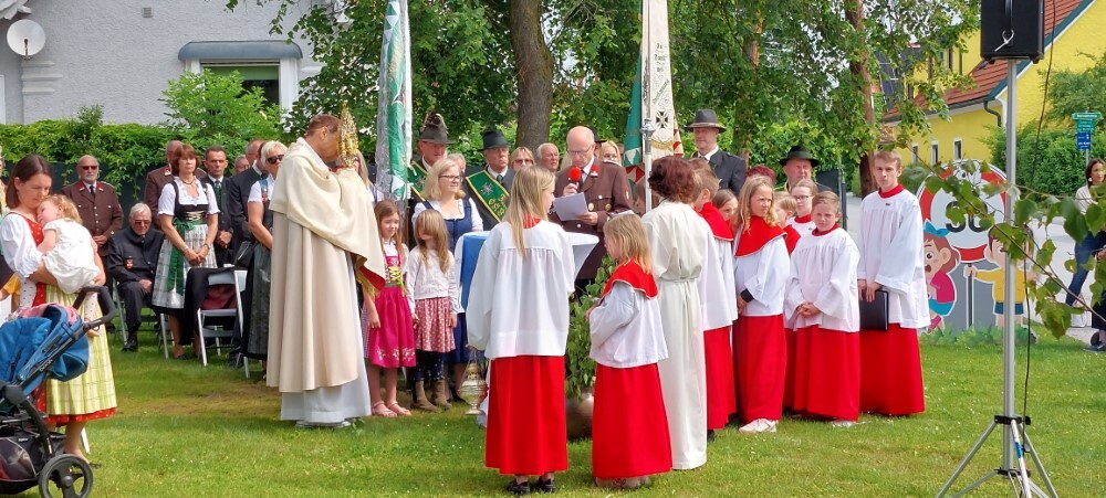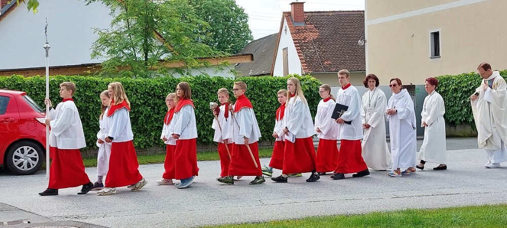 Im Anschluss an die Hl. Messe, zelebriert von Vikar Gerhard Hatzmann und begleitet von Kantorin, Lektoren und liturgischen Diensten beider Pfarren, fand eine Andacht bei den vier Stationen am Dorfplatz statt. Für die kleine Prozession waren vier Brottische als Altäre gerichtet, als Sinnbild für die vier Himmelsrichtungen und dafür, dass Christus der Heiland der ganzen Welt ist. Im gemeinsamen Liedruf "Brot des Lebens" zogen die liturgischen Dienste und die Kinder stellvertretend für das Volk Gottes zu den vier Altären: Brot der Liebe – Brot der Versöhnung – Brot des Friedens – Brot der Hoffnung. Zum Abschluss erteilte Vikar Hatzmann den Eucharistischen Segen, verbunden mit der Einladung, das Allerheiligste gemeinsam zur Kirche zu begleiten. Die Feier schloss mit dem gemeinsam gesungenen "Te Deum" ab. Zu den Feierlichkeiten waren auch die Vereine wie Feuerwehr und ÖKB eingeladen.