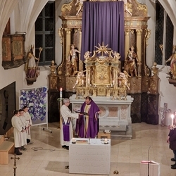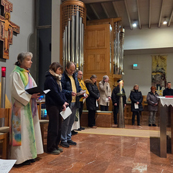 Vor dem Altar brannten 59 Teelichter für alle Menschen, die im letzten Jahr in unserer Pfarre verstorben sind. Ihre Namen wurden noch einmal laut ausgesprochen. Ein Teelicht leuchtete für alle Verstorbenen, die ungenannt blieben.