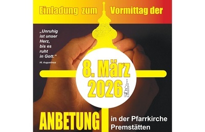 am 8.März 2026 in der Pfarrkirche Premstätten ab 7:55h Rosenkranzgebet, 8:30h Heilige Messe, 9:15h Aussetzung des Allerheiligsten, 9:20h Anbetungszeit, 9:50h Eucharistischer Segen