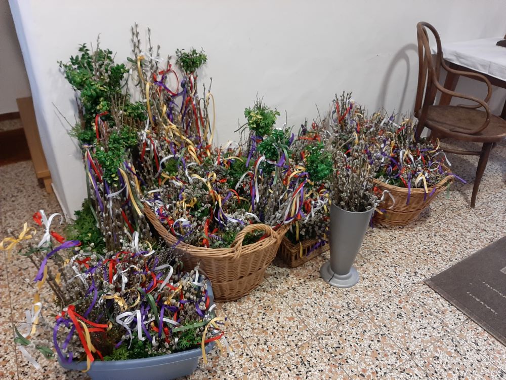Vor dem Gottesdienst wurden wieder Palmbuschen vom Pfarrgemeinderat, gegen eine kleine Spende angeboten. Die Palmweihe mit anschließender Leidensmesse wurde von unserer Musikkapelle musikalisch umrahmt.